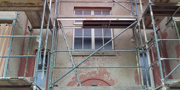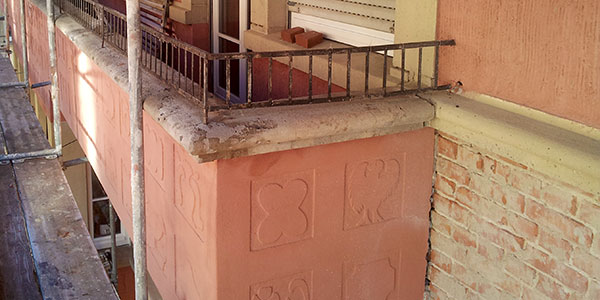 Trotz unsensibler und nicht materialverträglicher Ausbesserungen aus der Vergangenheit konnten ursprüngliche Materialien und Oberflächen, besonders die grob gekämmten Strukturen und die Reliefbilder an Erker und Balkonen der Schauseite, weitestgehend erhalten und restauriert werden.