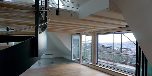 Drei lange Dachfenster, eines davon durch Aufklappen zum Dachaustritt erweiterbar, ermöglichen einen traumhaften Blick über den Stuttgarter Talkessel.